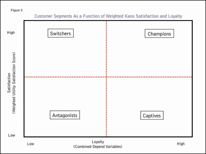 This newly created Kano performance utility score, combined with the loyalty measure created above (the three dependent scores) now gives us the ability to cluster respondents based on their utility satisfaction score and loyalty measurements. The two measures are then plotted on a graph (Figure 5).