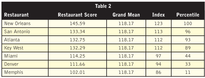 In Table 2, a comparison of restaurant ratings performances, a look at Key West’s index shows that it is doing better than average with an index of 112.