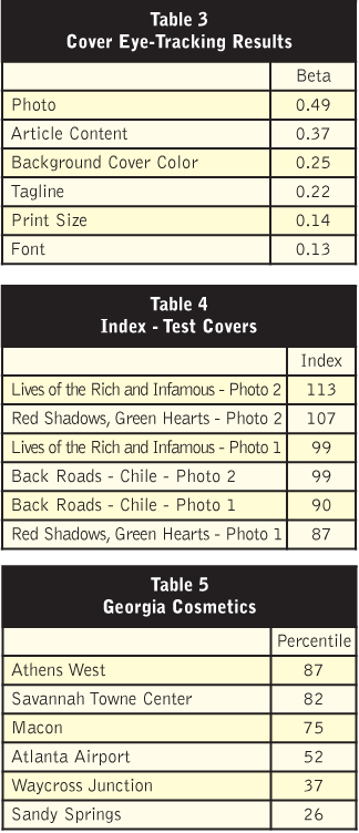 As an example, the performance score can be determined through an online survey which shows a magazine cover, then asks the invited participant to rate each of the factors (shown in Table 3), then give an overall score. Or, consumer views can be gathered through mall intercepts, where individuals in the target groups (e.g., twentysomething professional women) are shown a magazine cover. While an eye-tracking device measures the respondent’s eye movements, the participant is asked to rate each cover on a scale, say 1-to-7.