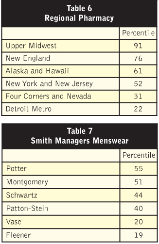 The benefit of this approach is that it allows WorldMart to shine a spotlight exactly where it wishes. Table 5 shows the output of a request for cosmetic store performance in one state. Table 6 shows pharmacy performance by region. And Table 7 shows performance by regional manager.
