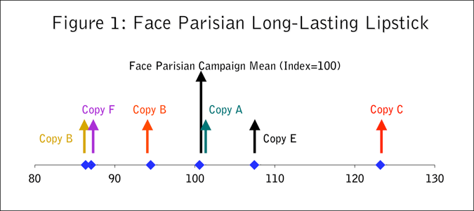 After a two-day mall intercept in Las Vegas, the McMann-Bronfman advertising agency is presenting the results to product managers at cosmetics firm Face Parisian. Rather than present detailed multivariate analysis, the ad agency is able to present a clear summary chart, as shown in Figure 1. I think the Face Parisian team will go with Copy C.