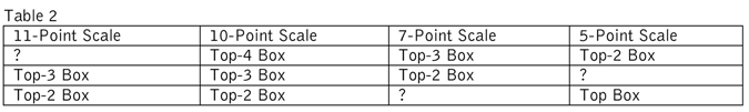 The boxed numbers show that, for example, a top-two box score on a five-point scale accounts for approximately the same proportion of the scale as a top-three box score on a seven-point scale, or top-four box score on a 10-point scale (approximately 40 percent). Hence, when data using these scales are to be compared, the relevant number of top boxes could be used. More generally, Table 2 provides (approximate) conversions for boxed scores among the four scales. A “?” indicates that a simple conversion is not available.