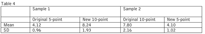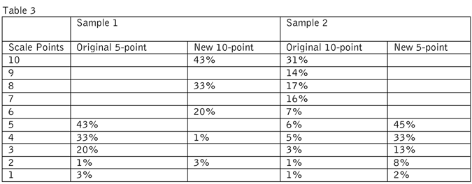 Converting the five-point scale to a new 10-point scale is somewhat more complicated because we are going from a situation with less information to one with more information. One relatively straightforward way to do the conversion is to simply multiply every scale point by two. In this case the resulting new 10-point scale will have only the five (even-numbered) scale points. Both conversions are shown in Table 3 for the data on hand.