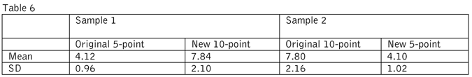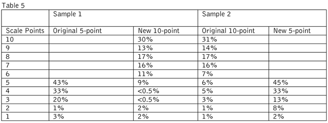 Table 5 shows the original tables, with the new 10-point scale calculated using the proportional re-distribution method. Thus for example, the 43 percent who gave a 5 on the original five-point scale have now been split such that 30 percent have a 10 rating and 13 percent have a 9 rating on the new 10-point scale.