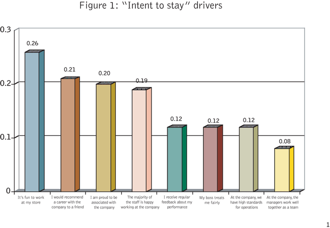 The power of regression analysis is that it can be run by filtered groups to more fully analyze intent-to-stay priorities. For example, length of employment affects intent-to-stay priorities. Employees with more than two years of experience put more emphasis on: “manager teamwork,” “receive regular feedback,” “boss treats fairly,” “products well received,” and “seek to increase sales.” Employees with less than two years of experience are more concerned with: “staff is happy,” “company pride,” “high standards at the company,” “receive enough training,” and “regional management cares.”