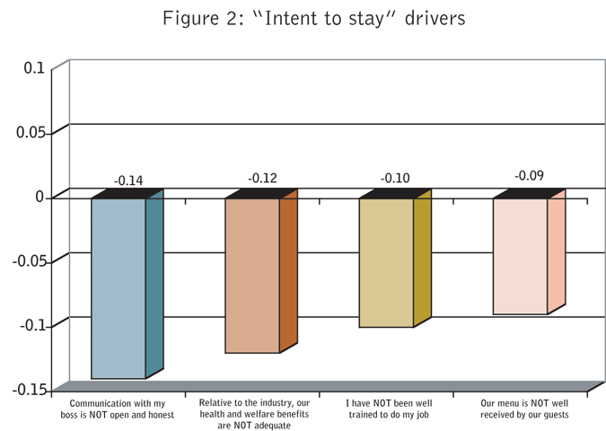 There were also five questions that were negatively related to intent to stay. In order to interpret negative drivers, it is useful to insert a “not” within the attribute. In Figure 2 we have inserted this for further illumination.