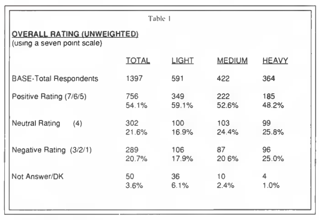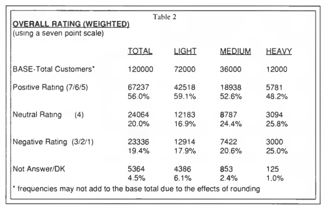 The task of WYSIWYG Research was to gather a minimum of 384 interviews within each of the segments of the customer population (for statistical precision purposes). A representative sample drawn from the population would generate 2300 completed interviews in the Light category by the time 384 Heavy users had been surveyed, assuming equal contact ratios, etc. Thus, a stratified sampling plan was implemented where equal numbers of potential respondents were randomly selected from the three usage categories prior to interviewing. To avoid bias resulting from external influences during the interviewing period, the instructions required that dialing continue in all three sample categories at an equal rate until the last quota was filled. Differences in the availability and refusal rates caused the Light and Medium quotas to be exceeded by the time the Heavy quota was filled. Table 1 illustrates the outcome of the survey with respect to the Overall Satisfaction question on an unweighted basis.
