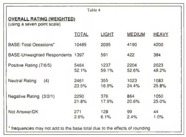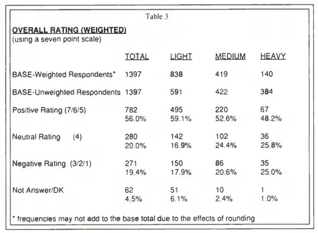 In the course of working with the client, WYSIWYG was asked to identify the sources of overall dissatisfaction. In addition to recommending a "key driver' analysis of specific service attributes in relation to the overall rating, it was recommended that the data be reviewed for statistically significant differences between the usage categories. A slightly modified weighting scheme was implemented to facilitate this investigation. Rather than weighting the data up to the total population targets, proportional targets were specified while the base number of interviews was held constant. Display of a second base line showing unweighted bases was requested through the software with the output shown here as Table 3.