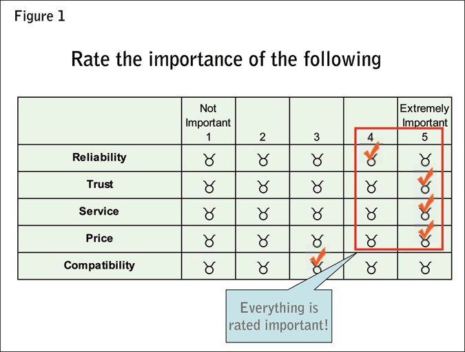 Following is a classic example of how we, as researchers, might go about trying to identify the importance of various elements that could affect our brand. We would traditionally use a Likert scale and ask someone to rate the importance of the attributes shown in Figure 1 to the extent that they would affect one’s decision on which brand to purchase. What we would typically get is answers like what we see in Figure 1, where many, many items are rated very high.