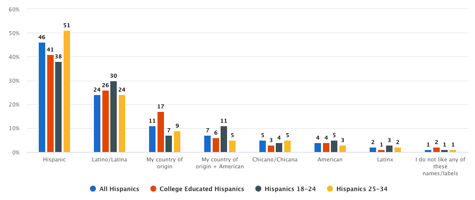 - Hispanics 18-24 have the lowest preference for the term “Hispanic” among the selected cohorts at 38%. Conversely, at 30%, they are the cohort to prefer “Latino/Latina” the most.