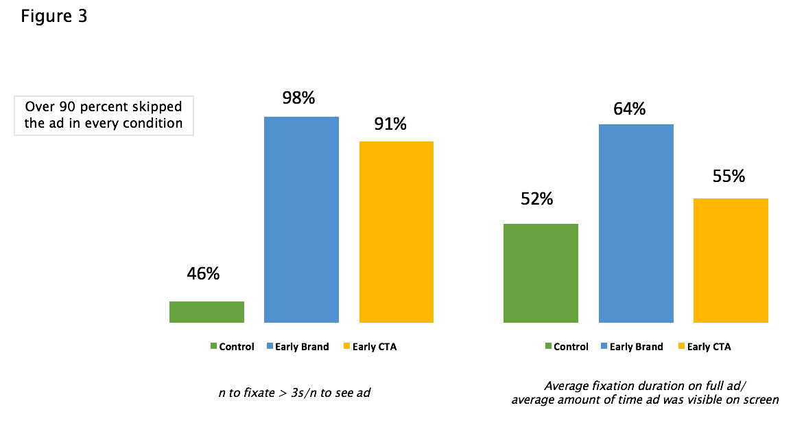Both early branding and an early CTA significantly increased the number of participants that looked at the ad for longer than three seconds. That indicated some effectiveness in capturing early attention. Did that initial increase in visual attention remain for the rest of the video? In all three conditions, more than 90 percent of participants skipped the ads after five seconds. However, the average duration of fixation on the ad relative to the amount of time the video was on the mobile screen was significantly higher on the early branding condition at 64 percent of the time, relative to 55 percent on early CTA and 52 percent on the control version (Figure 3). Previous Google research states that presenting the brand during the first five seconds led to higher ad recall, which supports the advantage of presenting early assets in the execution, especially the brand logo.
