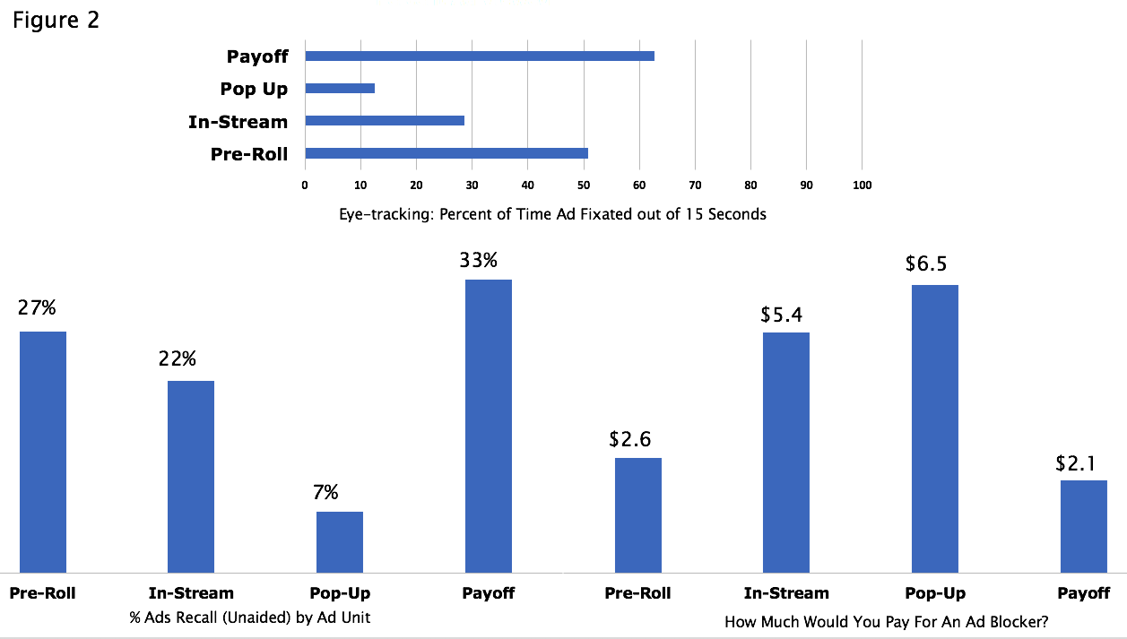 We also asked participants how much they would be willing to pay for an ad blocker after they experienced the different ad conditions. Results showed that the desire to block ads is indeed lower when the ad experience is less disruptive. While participants were willing to pay $6.50 and $5.40 after pop-up and mid-roll experiences, they reported that they would only pay $2.60 and $2.10 after experiencing the pre-roll and payoff ad units (Figure 2).