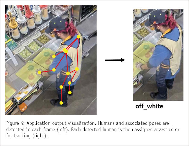 We implement a worker utilization application as a case study for our generalized multi-tenant deployment approach. This application has two DL-based components: human pose estimation to determine workstation activity status and subsequent tracking using a vest color classifier (Figure 3). There is a GUI component that visualizes the pose and assigned tracked worker ID in real time (Figure 4). This must be a highly performant application running at least five frames per second (FPS) for adequate responsiveness.