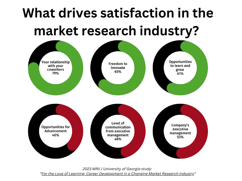Nearly two thirds (62%) of market research professionals surveyed say they are “very” or “completely” satisfied with their job. These findings are favorable for our industry when looked at in comparison with a recent study by Pew Research that found only half (51%) of Americans in general are highly satisfied with their jobs.
