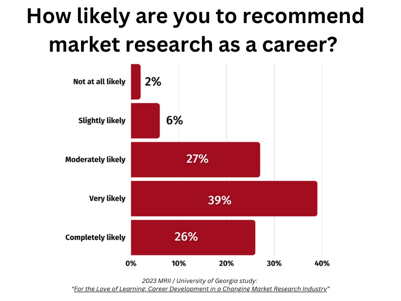 - Two thirds of respondents are likely to recommend market research/insights as a career, including 26% saying they would be completely likely and 39% who say they would be very likely.
