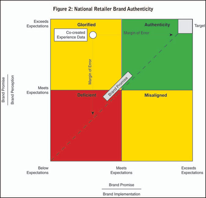The example shown in Table 1 highlights a large disconnect between customer perception (79 percent) and what’s actually occurring at the point-of-sale (49 percent). The “co-created experience” data point in Figure 2 shows an authenticity-based view of the customer experience that is “glorified.” Obviously, any management decisions or actions taken on the basis of either of these isolated data points (79 percent versus 49 percent) would have been risky because of the substantial margin of error associated with only having one piece of the puzzle.