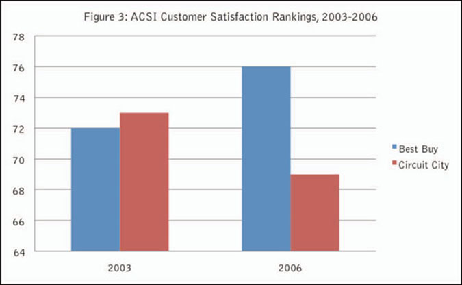 In 2003, Best Buy trailed Circuit City (Figure 3) on customer satisfaction measures (ACSI “Circuit City,” 2009). CEO Brad Anderson put Best Buy on a new growth path with two decisions: 1) a customer centricity initiative that placed the customer at the center of merchandising and other operational decisions; and 2) the purchase of Geek Squad, a consumer electronics support service.