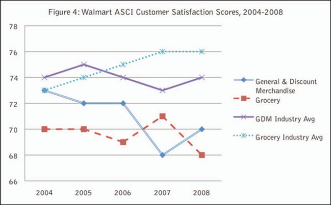 The stability of Walmart’s customer satisfaction scores (Figure 4) demonstrates a keen managerial focus on making price-driven value a reality. It also demonstrates that the core strategy has not changed.