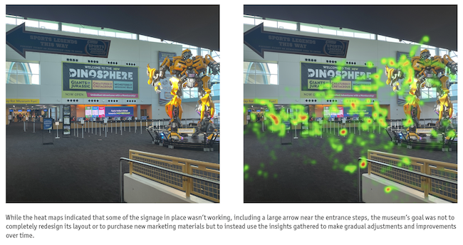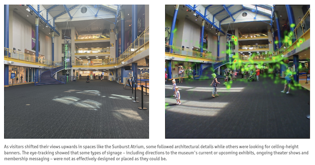 While completing these tasks, visitors shifted their views upwards as some followed architectural details while others were looking for ceiling-height banners. The eye-tracking showed that some types of signage – including directions to the museum's current or upcoming exhibits, ongoing theater shows and membership messaging – were not as effectively designed or placed as they could be.