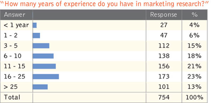 In general, our findings show that these client-company researchers are a nomadic, experienced bunch. Thirty percent have been at their current job for three to five years, 22 percent for one to two years and 20 percent for six to 10 years. Twenty-three percent reported having between 16 and 25 years of experience in marketing research (13 percent reported 25 or more years), 21 percent claimed 11 to 15 years and 18 percent have six to 10 years under their belt. The bulk of respondents were in the age ranges of 36 to 45 (34 percent) and 46 to 55 (25 percent).