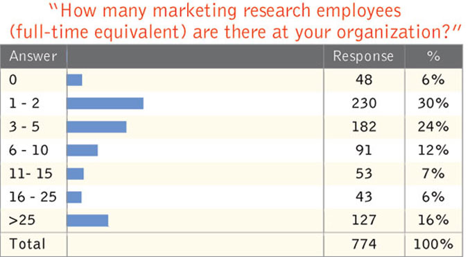 Some 230 respondents said their organization has one to two full-time marketing research employees, with 182 claiming three to five full-time research staffers and 127 saying they work at firms with more than 25 full-time researchers.