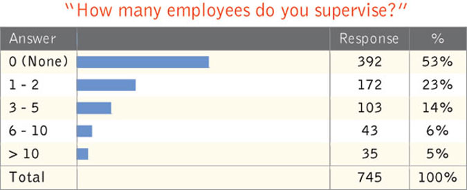 Fifty-three percent said they do not supervise any employees; 23 percent supervise one to two workers and 14 percent oversee three to five staffers.
