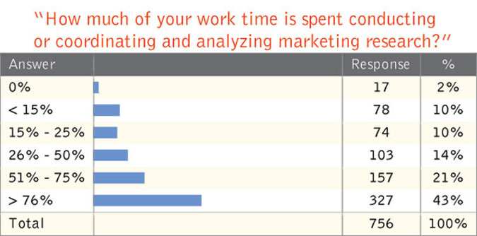 While certain respondent groups said they spend only a portion of their time conducting, coordinating and analyzing marketing research, a sizeable number (43 percent) said they spend more than 76 percent of their time on research-related duties.