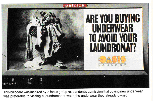 The content of a third ad came directly from a focus group respondent who claimed to prefer buying new underwear to visiting a laundromat to wash the underwear they already owned. This inspired a billboard showing a clothes basket overflowing with dirty clothes, bearing the tagline "Are you buying underwear to avoid your laundromat?"