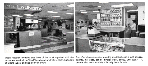 Unlike the laundromats most people are used to, Oasis locations boast numerous amenities, including modem decor, an on-duty attendant, projection TV with monitors placed throughout the laundromat showing films on videocassette, current magazines (instead of ancient, dog-eared copies of Popular Mechanics), snack bars, restrooms, and at least one dryer for every washer. Some stores also offer dry cleaning and a drop-off service which will wash, dry and fold clothes.
