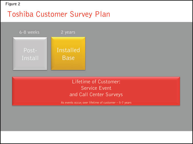Toshiba’s customer satisfaction survey process (Figure 2) consists of data collected six to eight weeks after system installation - the post-install survey; data collected two years after initial installation - the installed base survey; and then random surveys conducted when customers contact Toshiba’s call center (InTouch) for support, or when a customer engineer is sent out to a site - called IT and CE surveys. The post-install and installed base surveys ask questions about the sales process, installation and maintenance of the equipment, the applications or training process and the performance of the system.