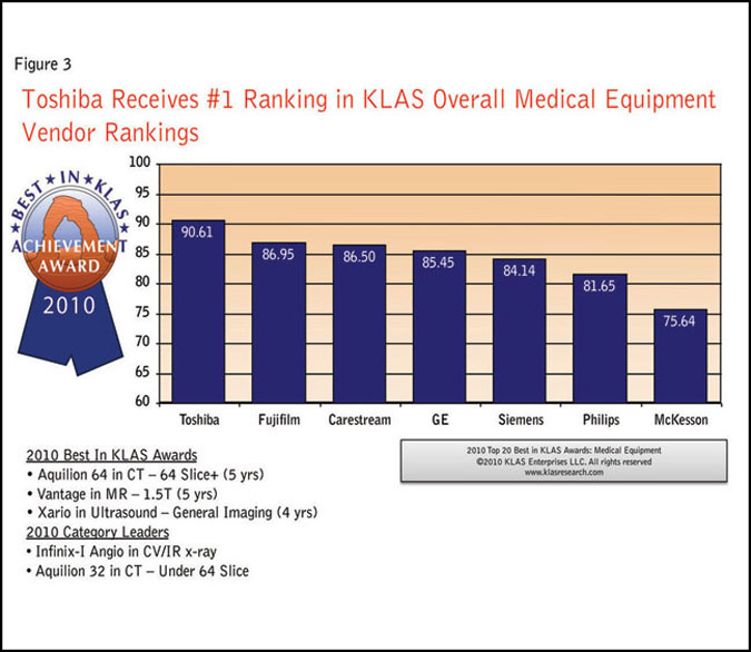 Within a couple years after Toshiba began its customer satisfaction survey program, the company achieved leading ratings by most industry measures. For instance, the company has held the No. 1 rating for nearly eight years in cat scanners - one of its core product lines - in data compiled by MD Buyline, a Dallas medical technology information firm. And the company holds top ratings in most modalities and with another third-party analyst organization, KLAS Enterprises, an Orem, Utah health care vendor performance measurement firm (Figure 3).
