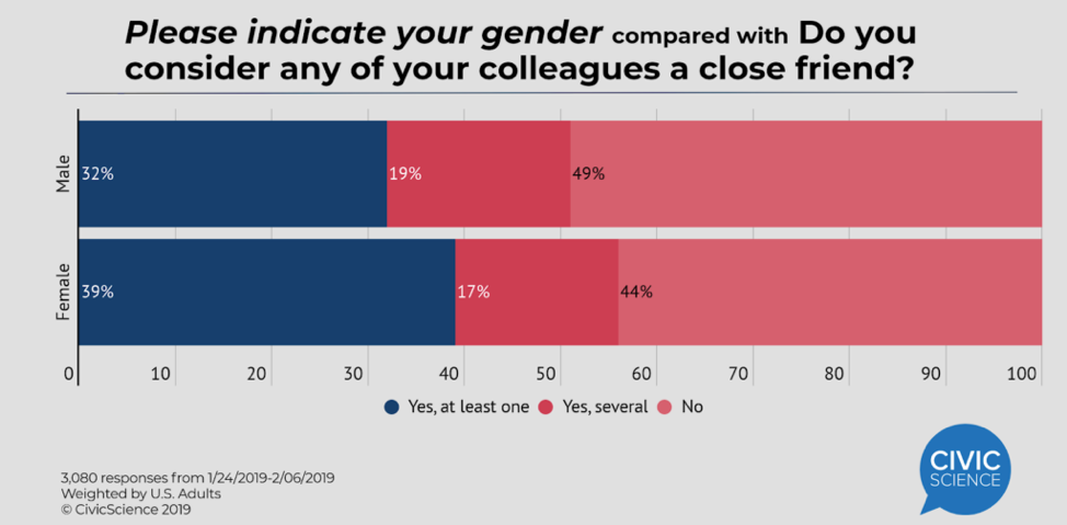 The data also reveals unique quirks among genders. While women are most likely to have at least one colleague they consider a friend, men are slightly more likely to report having several.