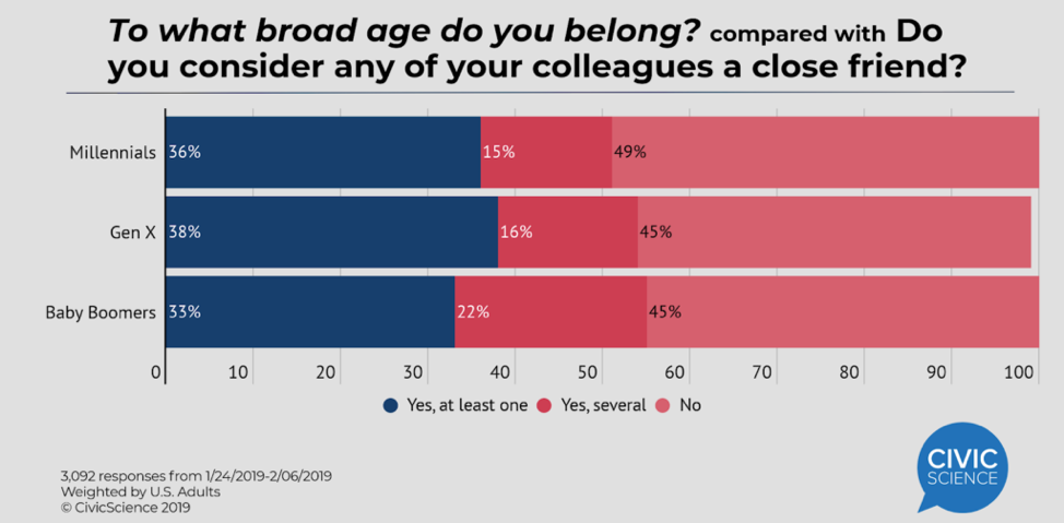 Thirty-six percent of Millennials polled do report having at least one colleague they consider a friend, but out of all the groups are the more likely to say they don’t consider any colleagues to be friends.