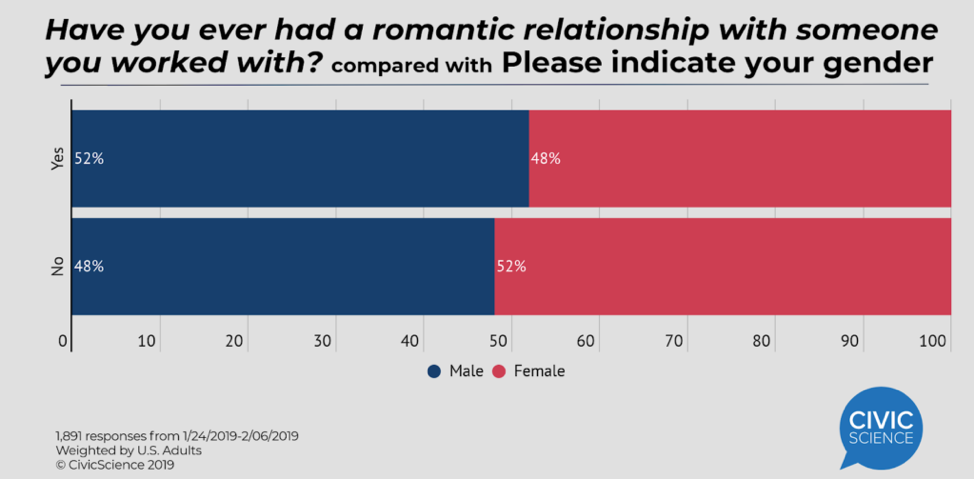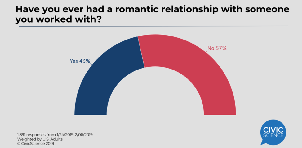 The office isn’t just a place for friendship. It can also be a place for romance, as 43 percent of U.S. adults report having a romantic relationship with someone at work at some point in their career.