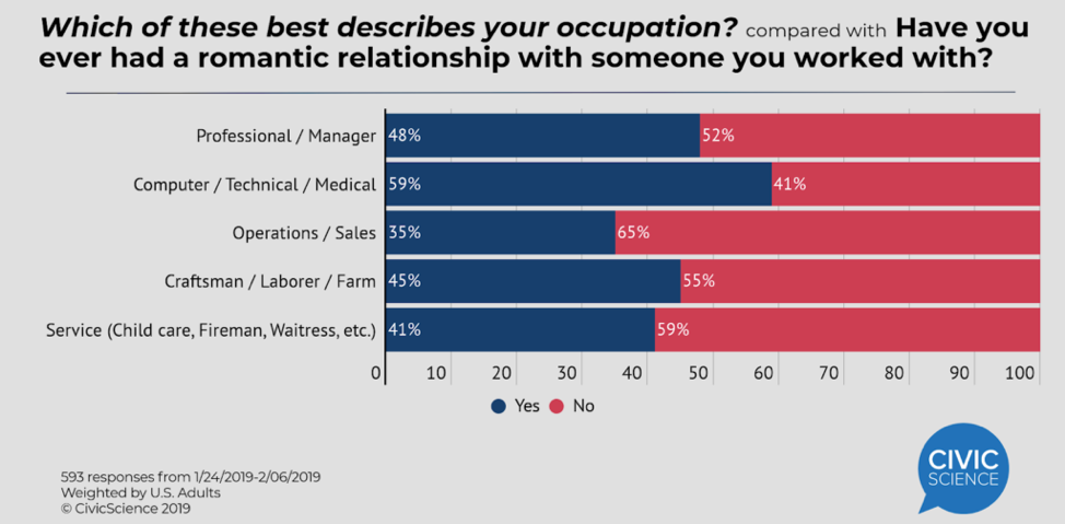 In this case, it’s clear that those in the tech and medical fields lead the way with office romance, with over half of respondents who work in these fields indicating that they have had a romantic relationship with a colleague.