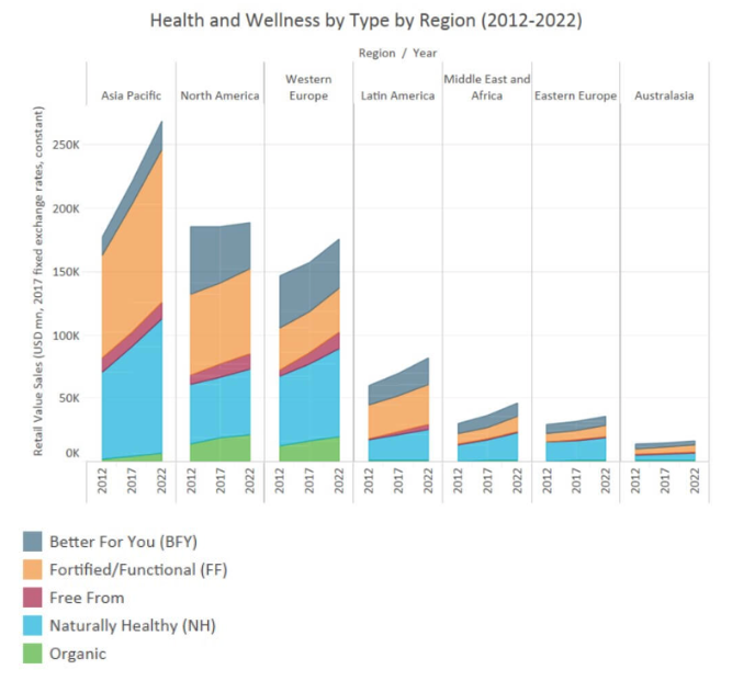 Despite the NH categories driving health and wellness trends, FF products are still current, valued at $247 billion in 2017 globally. Although the U.S. is still the largest country, the category is mainly boosted by Asia Pacific and Eastern Europe, where consumers are looking for products with functional ingredients such as probiotics, omegas or vitamins as a means of minimizing nutritional gaps in their daily diet or to boost their well-being.