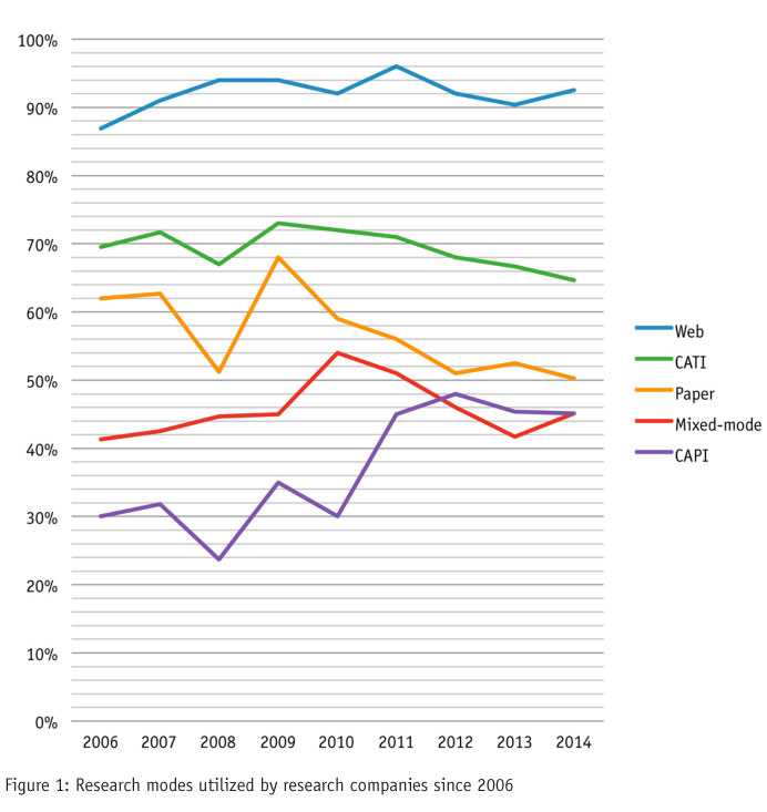 One of our key trackers follows the interview technologies or modes that research companies are utilizing. Figure 1 clearly shows how the sands are shifting – the less high-tech modes, paper and CATI, are on the wane, whereas newer and more high-tech modes are either holding their ground or growing.