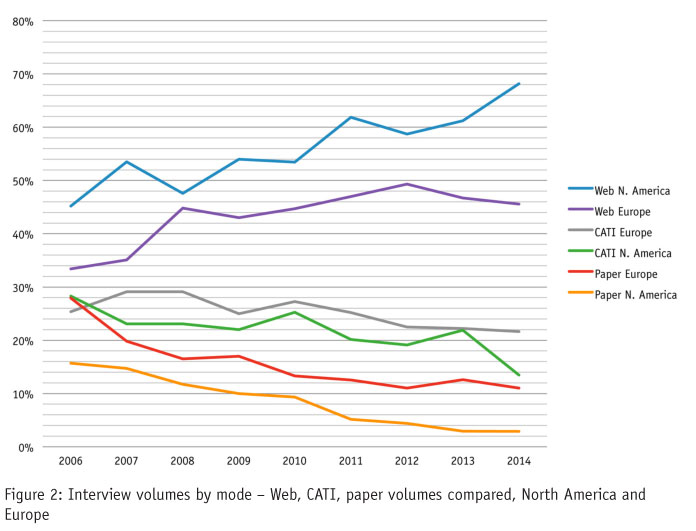 The trends are similar in Europe but not as pronounced, with Web and CATI accounting for 67 percent together and paper still clinging on to 11 percent.
