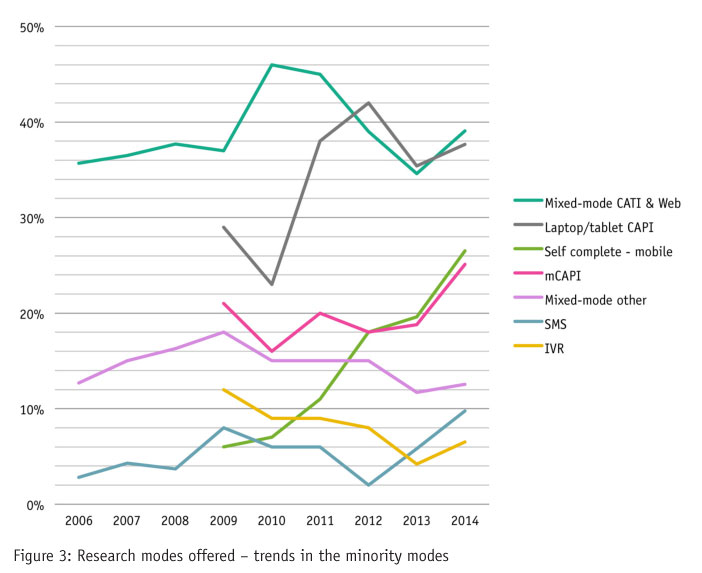 We also think CAPI is showing signs of a renaissance in the form of mobile CAPI (mCAPI). With the widespread availability of cheap consumer tablets and greatly improved support for data by the mobile networks, mCAPI makes perfect sense for face-to-face. The proportion of companies including this in their portfolios has increased slightly in 2014.