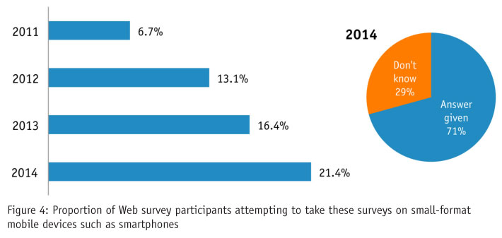 For the last four years, we have been asking companies how many of their survey participants are attempting to take Web or online surveys on smartphones and other mobile devices. It has risen progressively each year from 6.7 percent in 2011 to 21.4 percent in 2014 (Figure 4). There are more accurate measures of volume, including one recently published by the survey’s sponsor, FocusVision, which put the number of survey starts across the 74 million surveys fielded on its Decipher platform in 2014 at 7 percent for panel surveys and 22 percent for surveys using client-provided sample.1 However, the upward trajectory it reports is closely mirrored in what research firms report to us.