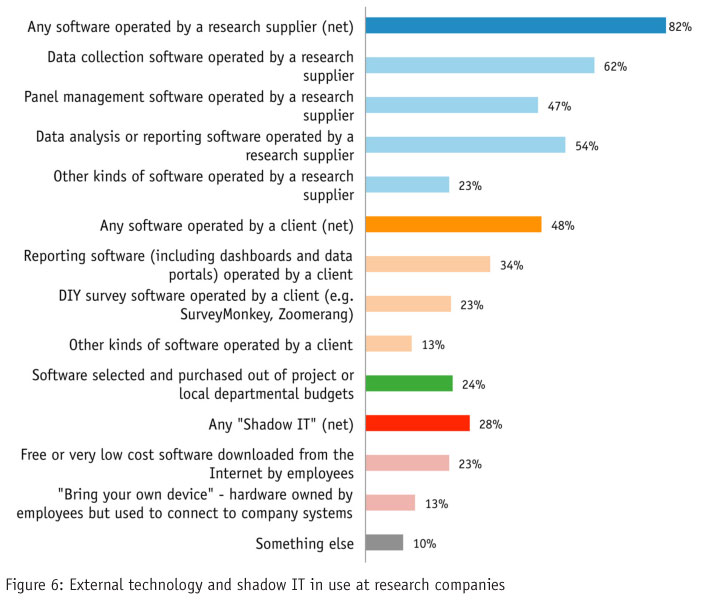 This reveals that using other people’s technology is very common across research companies of all sizes. In total, 82 percent of firms report they use software that is owned or controlled by a research supplier – data collection platforms being the most common – and 48 percent use software controlled by their clients, with reporting software most frequently referenced (Figure 6).
