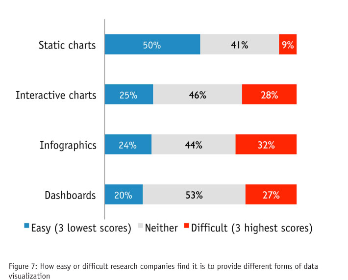 With the exception of static charts, more firms found each of the other methods difficult rather than easy. The question was a 10-point scale, calibrated from 1 for easy to 10 for difficult.