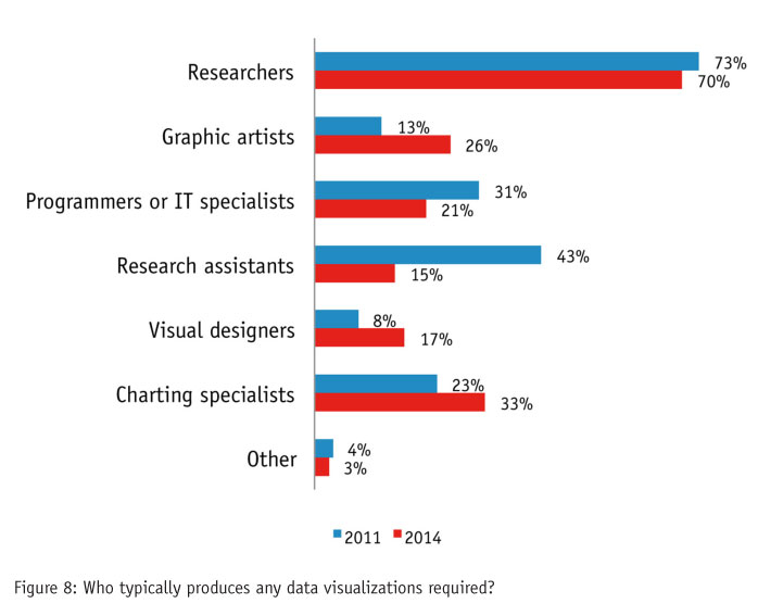 We asked who was involved in the production of data visualizations in both years. Not surprisingly, researchers are involved in most cases, but beyond that, the picture has changed dramatically between 2011 and 2014 (Figure 8).