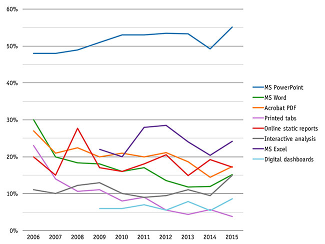 We have been asking MR companies what proportion of projects involves each of the main distribution methods since 2006. The one constant over time is PowerPoint’s stranglehold, while other methods continue to jockey for a position in the mix (Figure 2). With so much research today being delivered without necessarily culminating in a debrief before an actual audience, we have long questioned whether PowerPoint deserves to be the industry’s de facto standard for communicating research findings to decision-makers.