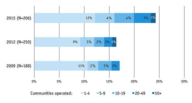The actual number of communities being run has also grown (Figure 3). In 2009 only 6 percent of companies had more than one: that has now doubled to 12 percent but it’s still rare to find anyone operating more than a handful. Just 8 percent have more than 10 and only 4 percent have more than 20.