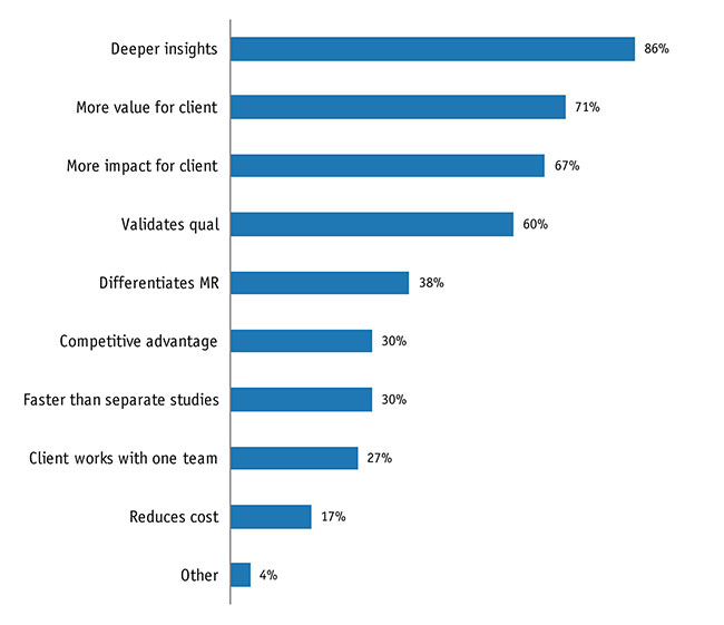 This year, for the first time, we asked some questions about blending qualitative and quantitative research. In the question in Figure 5, we asked what advantages companies saw in mixing qual with quant.