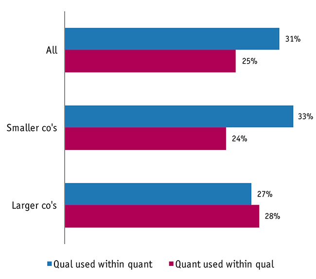 In addition, participants were asked how many quantitative projects incorporated some qualitative elements and vice versa (Figure 6). These show that blending qual and quant is widespread, though there are variations by region and company size. It is also clear that qual elements are more likely to be injected into to a quant intervention rather than the other way around.