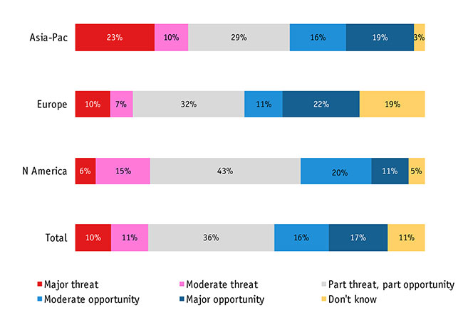 The picture from Asia-Pacific is very different to that of Europe and North America, with a far greater proportion seeing it as a “major threat.” In the previous question, it was also firms in Asia-Pacific that were more likely to be investing in innovation and also pursuing more discontinuous innovation approaches.