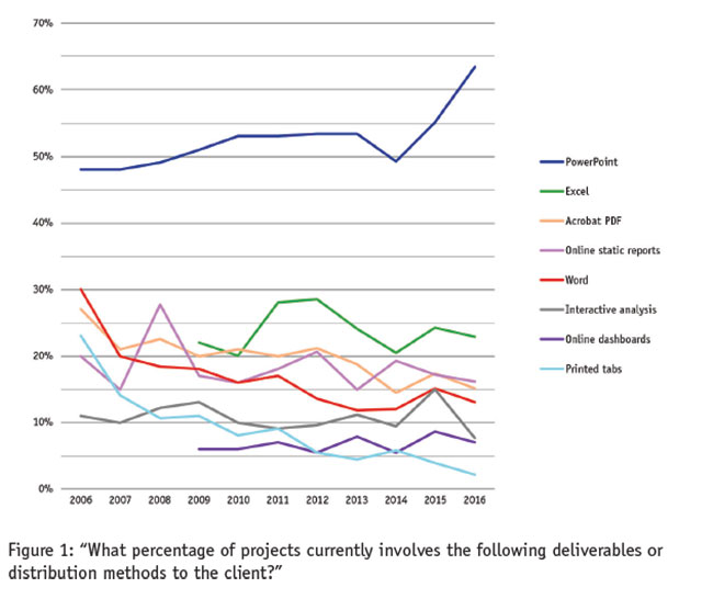 Since 2006, we’ve tracked the proportion of projects using the main results-delivery methods. To be frank, there has been little real change over time. Tables on paper and Acrobat PDF are falling out of favor but PowerPoint is surging ahead (Figure 1). There is no sign of a mass move towards high-tech delivery methods such as online dashboards or interactive analysis.