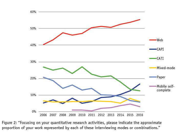 Below this headline shift, the picture is more complex. In the earlier days of Web, some of its growth was also fueled by self-completion mail studies on paper switching to the Internet. We suspect most of these paper-based studies converted to Web interviews long ago: it’s now the other side of paper that is making the transition. In 2016, for the first time, CAPI overtook CATI to become the industry’s second interview mode (Figure 2). Paper may seem inexpensive but the administrative burden is high. Today, the availability of low-cost tablets and smartphones, and the ubiquity of Wi-Fi and cellular data networks, means there is a lot less resistance to overcome in moving face-to-face interviews from paper to CAPI.